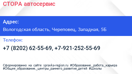 СТОРА, автосервис по адресу Вологодская область, Череповец, Западная, 5Б в дальнейшем Организация, размещена в следующих категориях:
