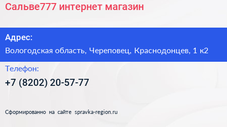 Сальве777, интернет-магазин по адресу Вологодская область, Череповец, Краснодонцев, 1 к2 в дальнейшем Организация, размещена в следующих категориях: