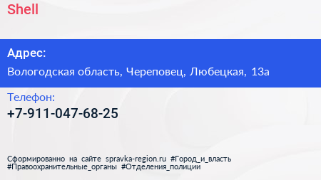 Shell по адресу Вологодская область, Череповец, Любецкая, 13а в дальнейшем Организация, размещена в следующих категориях:
