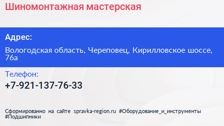 Шиномонтажная мастерская по адресу Вологодская область, Череповец, Кирилловское шоссе, 76а в дальнейшем Организация, размещена в следующих категориях: