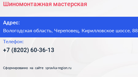Шиномонтажная мастерская по адресу Вологодская область, Череповец, Кирилловское шоссе, 88 в дальнейшем Организация, размещена в следующих категориях: