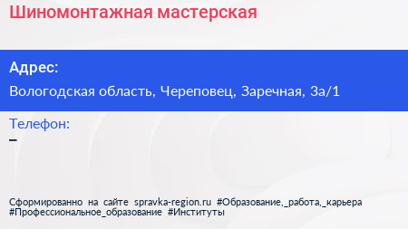 Шиномонтажная мастерская по адресу Вологодская область, Череповец, Заречная, 3а/1 в дальнейшем Организация, размещена в следующих категориях: