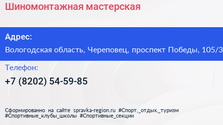 Шиномонтажная мастерская по адресу Вологодская область, Череповец, проспект Победы, 105/3 в дальнейшем Организация, размещена в следующих категориях: