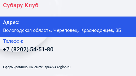 Субару-Клуб по адресу Вологодская область, Череповец, Краснодонцев, 3Б в дальнейшем Организация, размещена в следующих категориях: