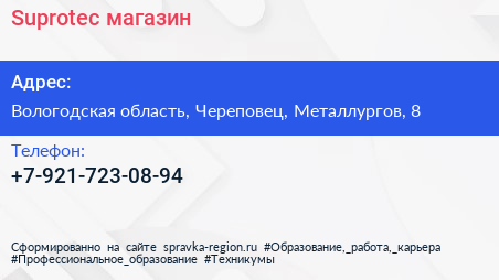 Suprotec, магазин по адресу Вологодская область, Череповец, Металлургов, 8 в дальнейшем Организация, размещена в следующих категориях: