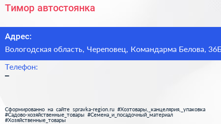 Тимор, автостоянка по адресу Вологодская область, Череповец, Командарма Белова, 36Б в дальнейшем Организация, размещена в следующих категориях: