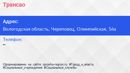 Трансао по адресу Вологодская область, Череповец, Олимпийская, 56а в дальнейшем Организация, размещена в следующих категориях: