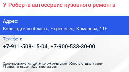 У Роберта, автосервис кузовного ремонта по адресу Вологодская область, Череповец, Комарова, 11Б в дальнейшем Организация, размещена в следующих категориях: