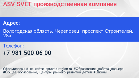 ASV-SVET, производственная компания по адресу Вологодская область, Череповец, проспект Строителей, 28а в дальнейшем Организация, размещена в следующих категориях: