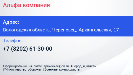 Альфа, компания по адресу Вологодская область, Череповец, Архангельская, 17 в дальнейшем Организация, размещена в следующих категориях: