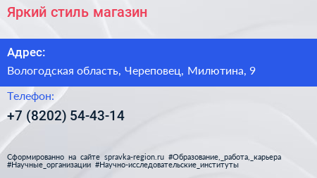 Яркий стиль, магазин по адресу Вологодская область, Череповец, Милютина, 9 в дальнейшем Организация, размещена в следующих категориях: