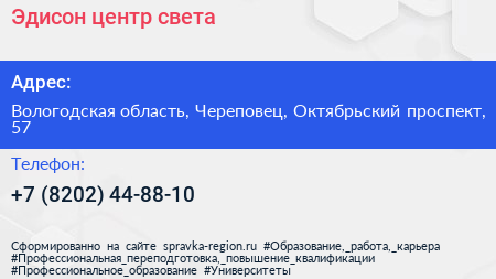Эдисон, центр света по адресу Вологодская область, Череповец, Октябрьский проспект, 57 в дальнейшем Организация, размещена в следующих категориях: