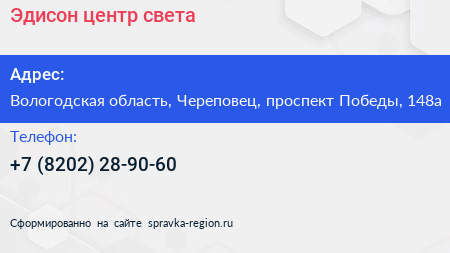 Эдисон, центр света по адресу Вологодская область, Череповец, проспект Победы, 148а в дальнейшем Организация, размещена в следующих категориях: