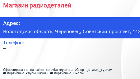Магазин радиодеталей по адресу Вологодская область, Череповец, Советский проспект, 113 в дальнейшем Организация, размещена в следующих категориях: