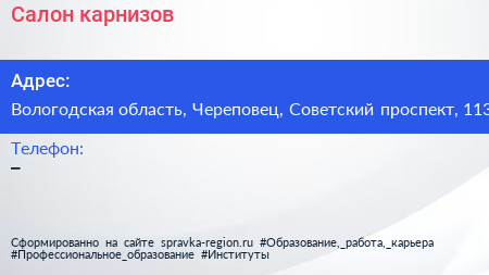 Салон карнизов по адресу Вологодская область, Череповец, Советский проспект, 113 в дальнейшем Организация, размещена в следующих категориях: