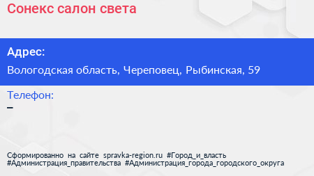 Сонекс, салон света по адресу Вологодская область, Череповец, Рыбинская, 59 в дальнейшем Организация, размещена в следующих категориях: