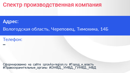 Спектр, производственная компания по адресу Вологодская область, Череповец, Тимохина, 14Б в дальнейшем Организация, размещена в следующих категориях: