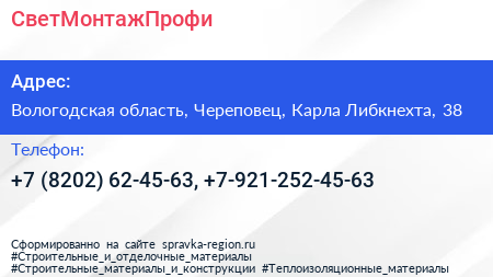 СветМонтажПрофи по адресу Вологодская область, Череповец, Карла Либкнехта, 38 в дальнейшем Организация, размещена в следующих категориях: