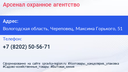 Арсенал, охранное агентство по адресу Вологодская область, Череповец, Максима Горького, 51 в дальнейшем Организация, размещена в следующих категориях: