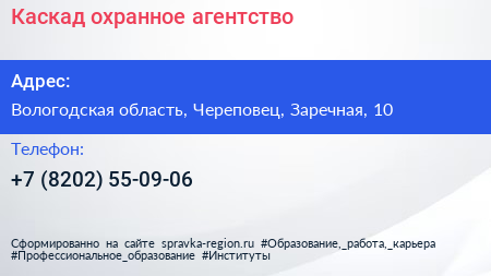 Каскад, охранное агентство по адресу Вологодская область, Череповец, Заречная, 10 в дальнейшем Организация, размещена в следующих категориях: