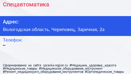 Спецавтоматика по адресу Вологодская область, Череповец, Заречная, 2а в дальнейшем Организация, размещена в следующих категориях: