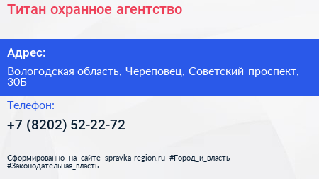 Титан, охранное агентство по адресу Вологодская область, Череповец, Советский проспект, 30Б в дальнейшем Организация, размещена в следующих категориях:
