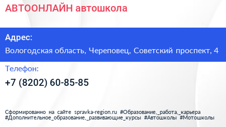 АВТООНЛАЙН, автошкола по адресу Вологодская область, Череповец, Советский проспект, 4 в дальнейшем Организация, размещена в следующих категориях: