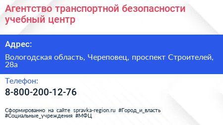 Агентство транспортной безопасности, учебный центр по адресу Вологодская область, Череповец, проспект Строителей, 28а в дальнейшем Организация, размещена в следующих категориях: