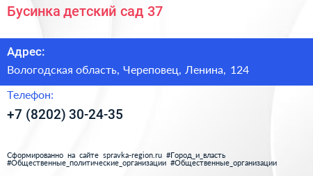 Бусинка, детский сад №37 по адресу Вологодская область, Череповец, Ленина, 124 в дальнейшем Организация, размещена в следующих категориях: