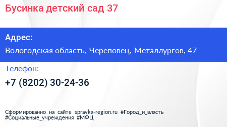 Бусинка, детский сад №37 по адресу Вологодская область, Череповец, Металлургов, 47 в дальнейшем Организация, размещена в следующих категориях: