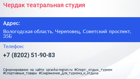 Чердак, театральная студия по адресу Вологодская область, Череповец, Советский проспект, 35Б в дальнейшем Организация, размещена в следующих категориях: