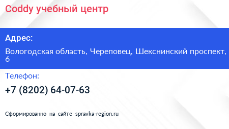 Coddy, учебный центр по адресу Вологодская область, Череповец, Шекснинский проспект, 6 в дальнейшем Организация, размещена в следующих категориях: