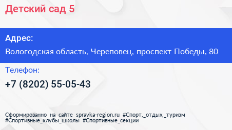 Детский сад №5 по адресу Вологодская область, Череповец, проспект Победы, 80 в дальнейшем Организация, размещена в следующих категориях:
