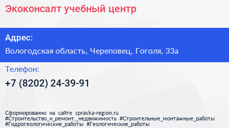 Экоконсалт, учебный центр по адресу Вологодская область, Череповец, Гоголя, 33а в дальнейшем Организация, размещена в следующих категориях: