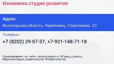 Изюминка, студия развития по адресу Вологодская область, Череповец, Спортивная, 13 в дальнейшем Организация, размещена в следующих категориях: