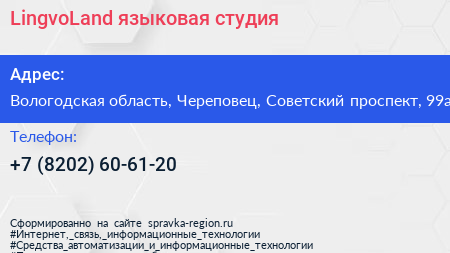 LingvoLand, языковая студия по адресу Вологодская область, Череповец, Советский проспект, 99а в дальнейшем Организация, размещена в следующих категориях: