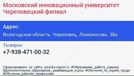 Московский инновационный университет, Череповецкий филиал по адресу Вологодская область, Череповец, Ломоносова, 38а в дальнейшем Организация, размещена в следующих категориях: