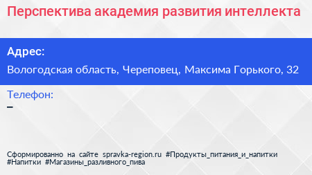 Перспектива, академия развития интеллекта по адресу Вологодская область, Череповец, Максима Горького, 32 в дальнейшем Организация, размещена в следующих категориях: