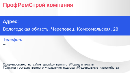 ПрофРемСтрой, компания по адресу Вологодская область, Череповец, Комсомольская, 28 в дальнейшем Организация, размещена в следующих категориях: