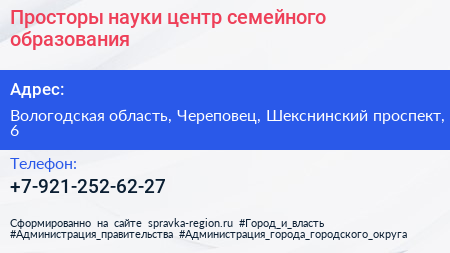 Просторы науки, центр семейного образования по адресу Вологодская область, Череповец, Шекснинский проспект, 6 в дальнейшем Организация, размещена в следующих категориях: