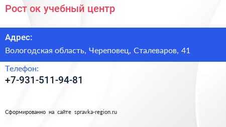 Рост.ок!, учебный центр по адресу Вологодская область, Череповец, Сталеваров, 41 в дальнейшем Организация, размещена в следующих категориях: