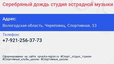 Серебряный дождь, студия эстрадной музыки по адресу Вологодская область, Череповец, Спортивная, 13 в дальнейшем Организация, размещена в следующих категориях: