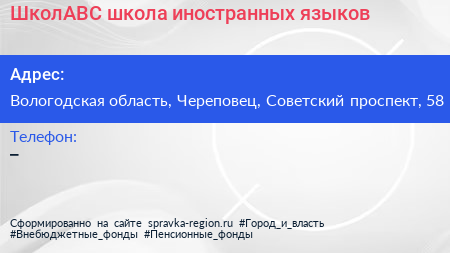 ШколABC, школа иностранных языков по адресу Вологодская область, Череповец, Советский проспект, 58 в дальнейшем Организация, размещена в следующих категориях: