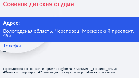 Совёнок, детская студия по адресу Вологодская область, Череповец, Московский проспект, 49а в дальнейшем Организация, размещена в следующих категориях: