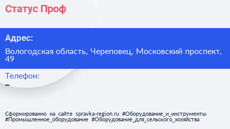 Статус Проф по адресу Вологодская область, Череповец, Московский проспект, 49 в дальнейшем Организация, размещена в следующих категориях: