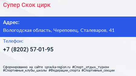 Супер-Скок, цирк по адресу Вологодская область, Череповец, Сталеваров, 41 в дальнейшем Организация, размещена в следующих категориях: