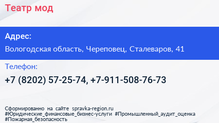 Театр мод по адресу Вологодская область, Череповец, Сталеваров, 41 в дальнейшем Организация, размещена в следующих категориях: