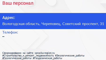 Ваш персонал по адресу Вологодская область, Череповец, Советский проспект, 31 в дальнейшем Организация, размещена в следующих категориях: