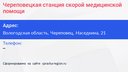 Череповецкая станция скорой медицинской помощи по адресу Вологодская область, Череповец, Наседкина, 21 в дальнейшем Организация, размещена в следующих категориях: