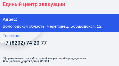 Единый центр эвакуации по адресу Вологодская область, Череповец, Боршодская, 12 в дальнейшем Организация, размещена в следующих категориях: